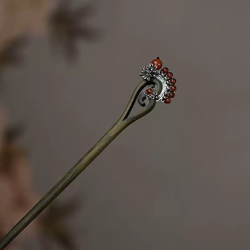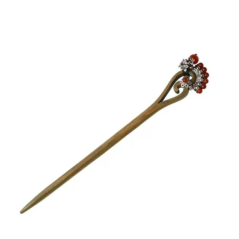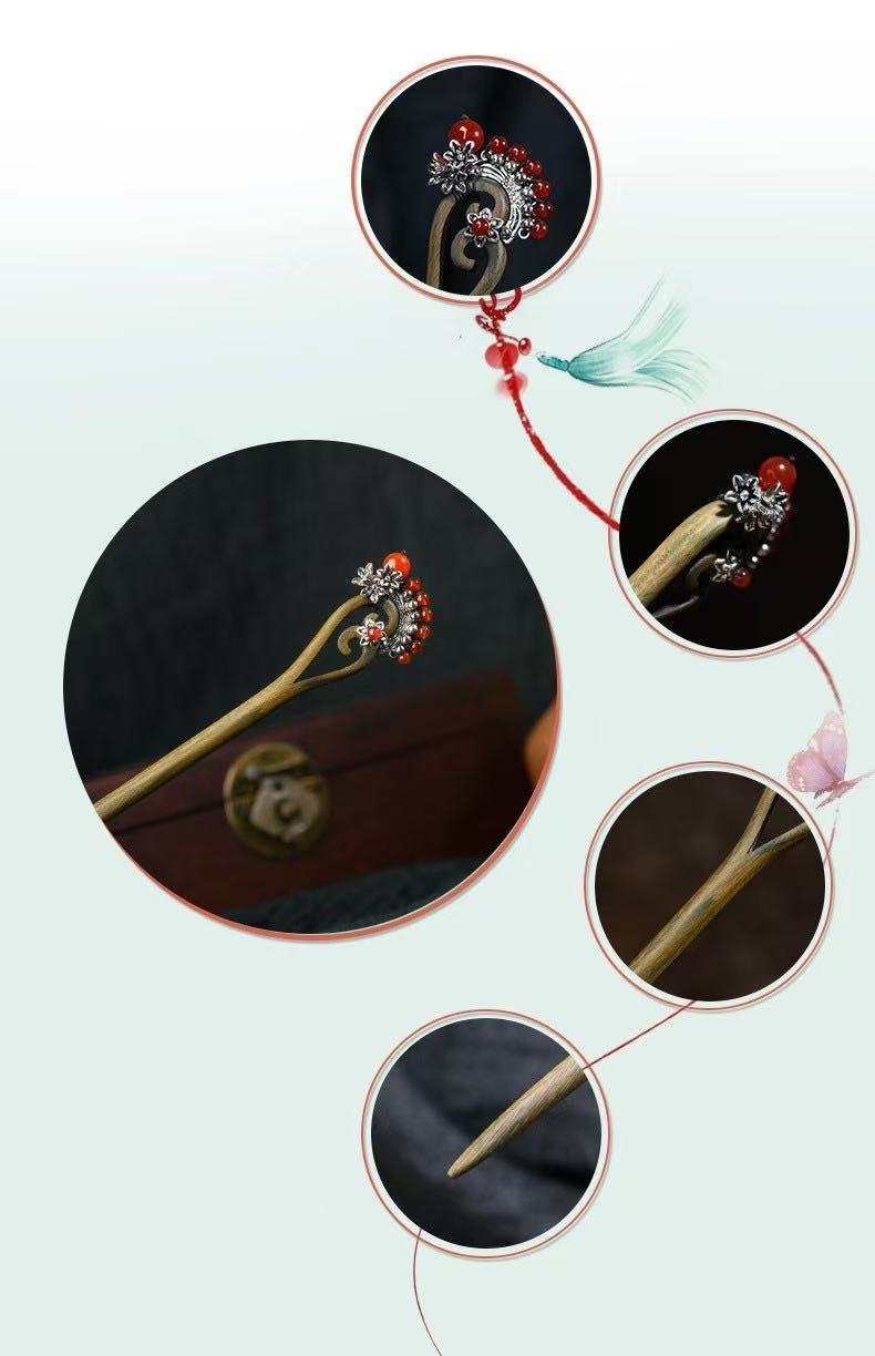 The chinese-style hairpin is made of premium Green Sandalwood, which is prized for ts beautiful, natural green color and sweet, uplifting fragrance. Its soothing aroma helps reduce stress and anxiety, promoting a sense of peace.